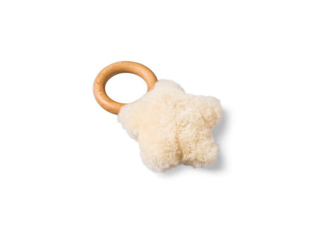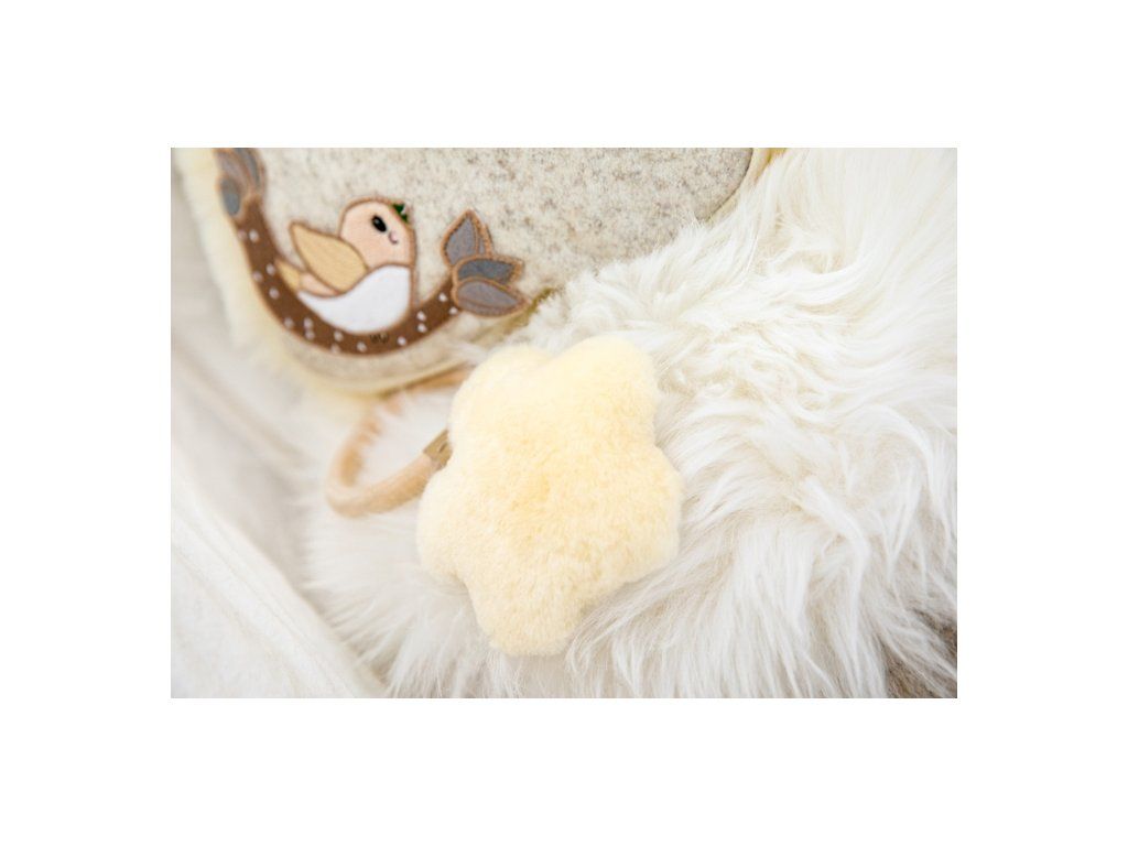 Ein liebevolles Geschenk für Ihr Baby: unsere STELLA Rassel aus Buchenholz und weichem Lammfell.